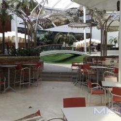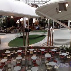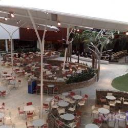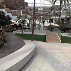 La cascada del centro comercial exigió realizar vasos en diferentes alturas de manera tal que el agua desborde de cada uno de ellos hacia el contiguo inferior. La forma curva de todo el desarrollo fue conseguida gracias a la flexibilidad del panel en su etapa de montaje.