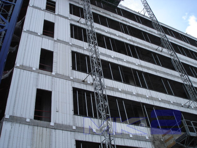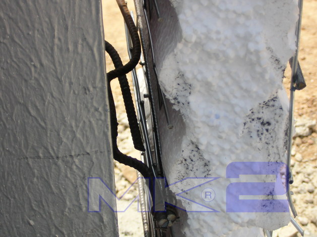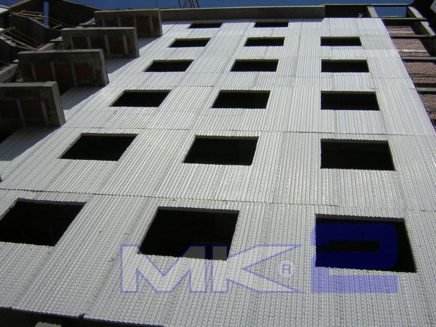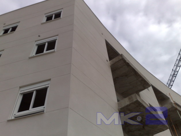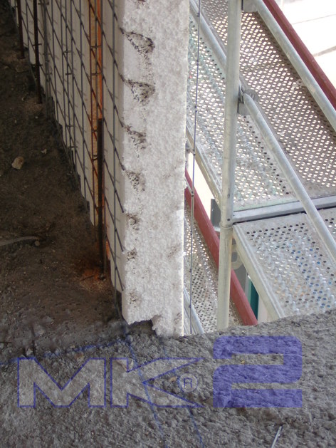 La fachada MK2 se completa “in situ” con la aplicación mediante gunitado por vía húmeda, de un espesor de 30 mm en cada cara de micro hormigón con una resistencia a la compresión mínima de 16 MPa sobre la que se podrá aplicar monocapa, mortero acrílico o simplemente pintura.